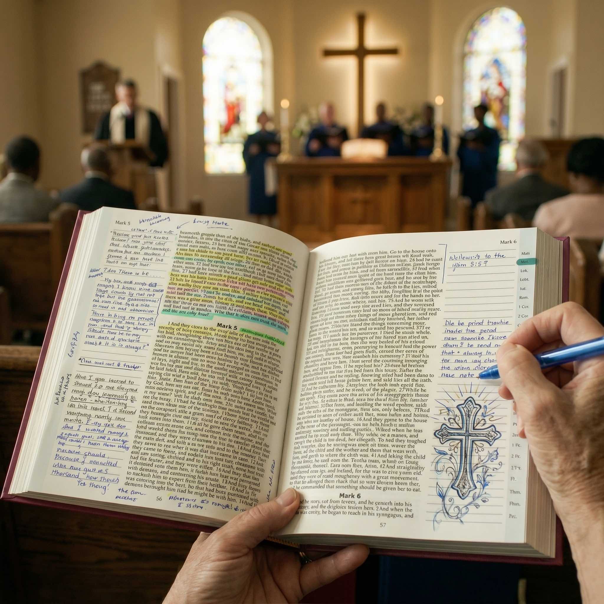 No more nodding along and forgetting the sermon by Tuesday. Perfect Bible's wide margins on every page let you write down the words that touched you, the verses your pastor preached on, and what God laid on your heart — right there next to the Scripture. You'll leave church with more than a memory.